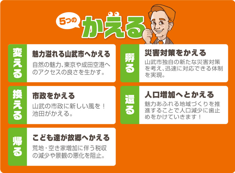 池田久和は五つの「かえる」をキャッチコピーに、市政の立場から山武市をかえてゆきます。